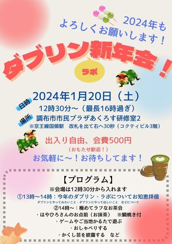今年も残り半月。来年についていろいろ考える時期になりました。 ダブリン・ラボも、来年の計画を徐々に立てつつあります。 来年の企画の第一弾として、新年会を企画しました。 1月20日の午後に、調布市国領のあくろすでやろうと思ってます。 出入り自由の、…